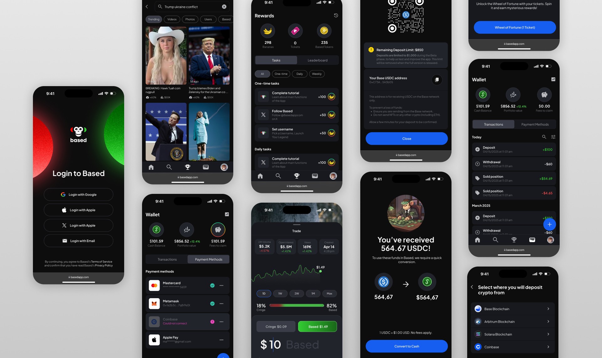Web3 UX is notoriously awful. We had complex AMMs (Automated Market Makers) and perpetual futures contracts running under the hood. My core design challenge was abstracting all of that friction away. The user shouldn’t feel like they are staring at a Bloomberg terminal; they should feel like they are playing an arcade game. We needed a UI that allowed users to execute trades as seamlessly as "liking" an Instagram post. The Execution & Core Mechanics The "Scroll. Trade. Profit." Loop I designed a frictionless, full-screen vertical video feed (Web2-native feel) integrated with hyper-fast binary trading modules. You see a meme, a political debate, or a pop-culture moment? You instantly swipe to buy "Based" or "Cringe" shares. Zero jargon, zero gas-fee pop-ups—just pure, unfiltered market sentiment. Gamification & The Based Banana Cartel To drive insane retention and viral loops, I spearheaded the platform's gamification UX. The Wheel of Based: Designed the micro-interactions and dopamine-heavy animations for our daily spin mechanic ("Grind. Spin. Win."). Status Tiers: Created the visual hierarchy and badge system for the leaderboards, climaxing with the apex predator tier: The Based Banana Cartel. I designed whale-tier profiles to look visually distinct, giving top traders the ultimate flex. The Visual Identity & Microcopy The brand aesthetic is high-energy, provocative, and aggressively fun. I established a design system that leans into Gen-Z internet humor and crypto degen lore without alienating mainstream users. Color & Motion: High contrast, neon accents, and kinetic typography that makes winning a trade feel like a casino jackpot. UX Copy: Purged all boring error states and empty states. Replaced standard UI text with culturally native microcopy (e.g., turning a standard withdrawal success message into a prompt to secure #wifechangingmoney). The Impact Successfully bridged the gap between complex crypto rails and consumer social, delivering an app where users can literally trade the zeitgeist. We didn't just build an app; we built a financialized culture engine.