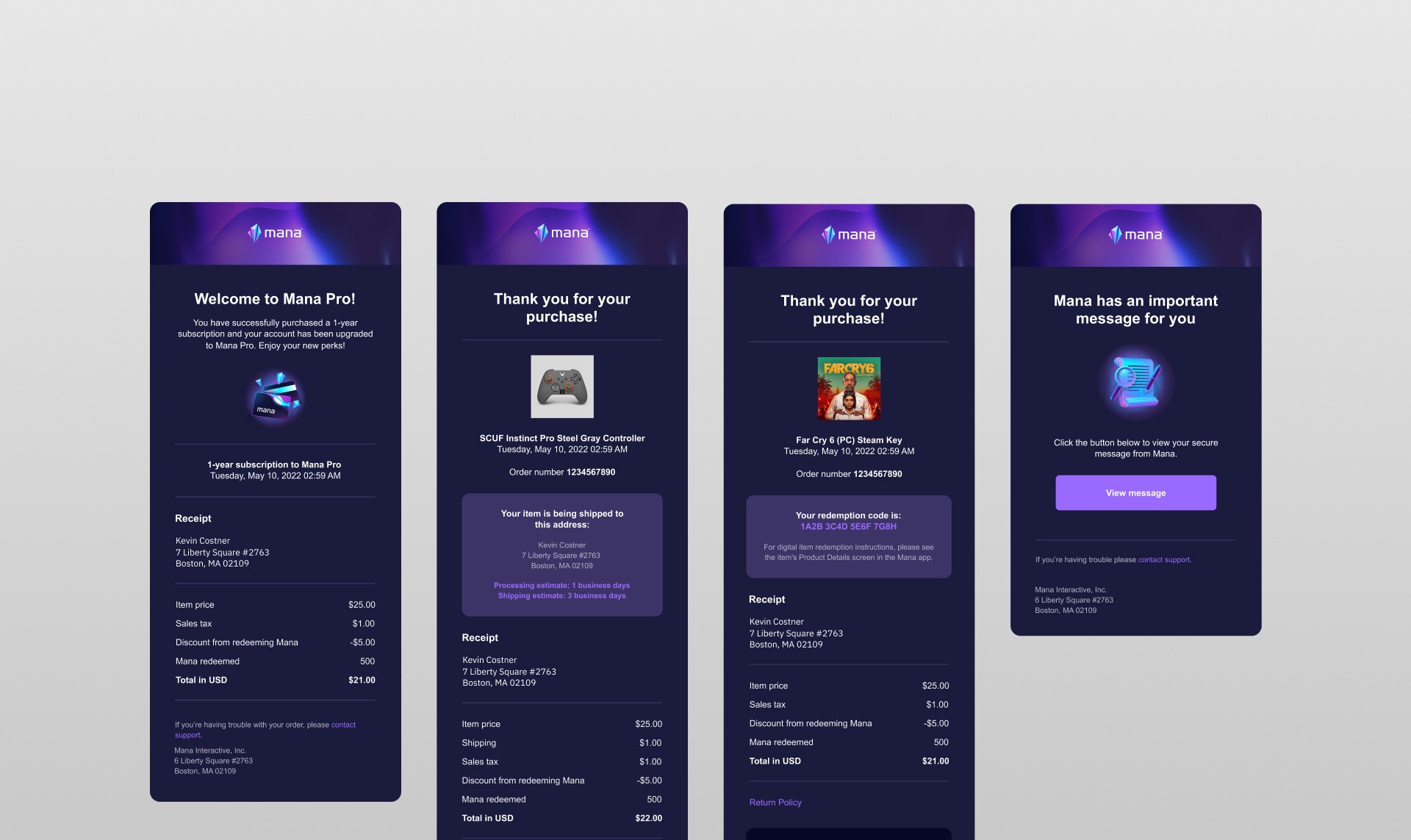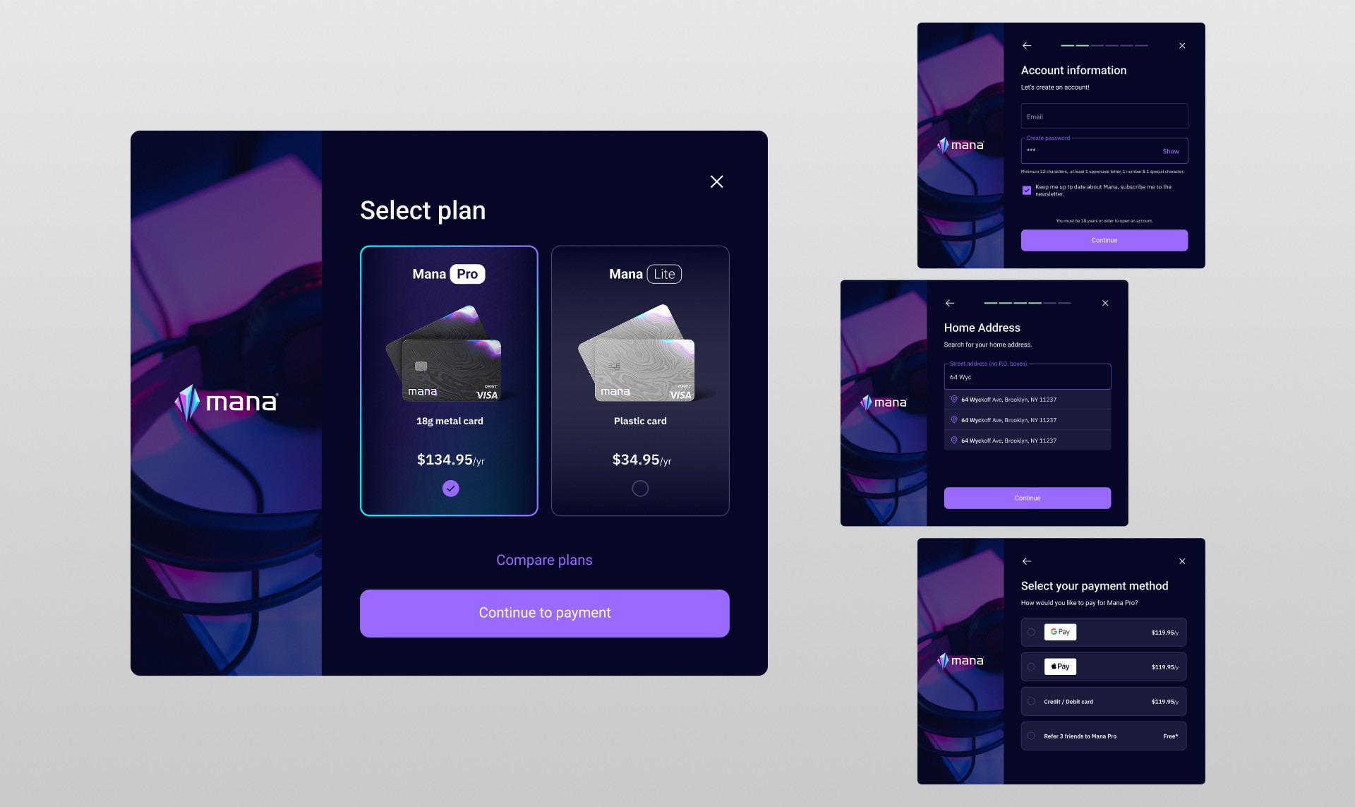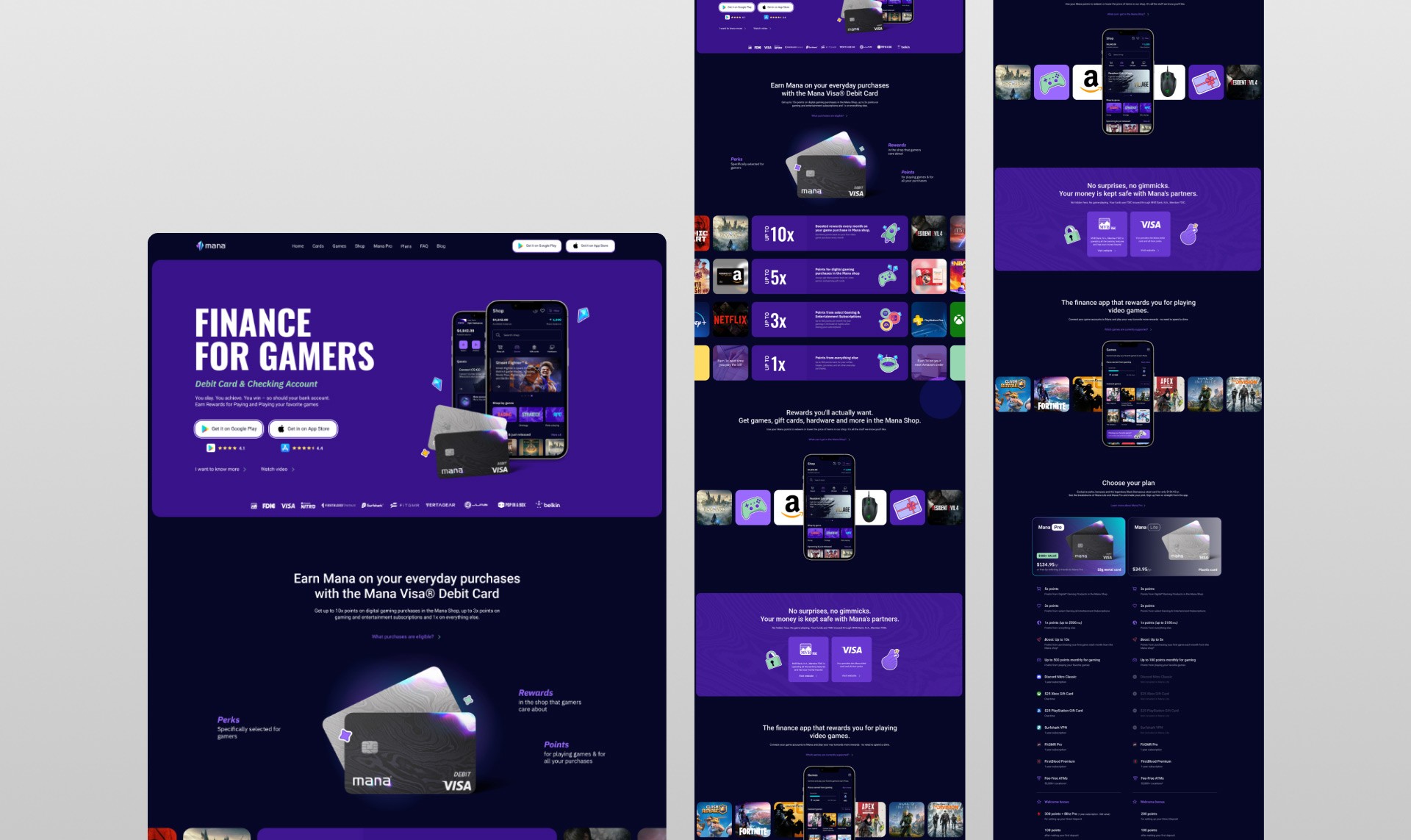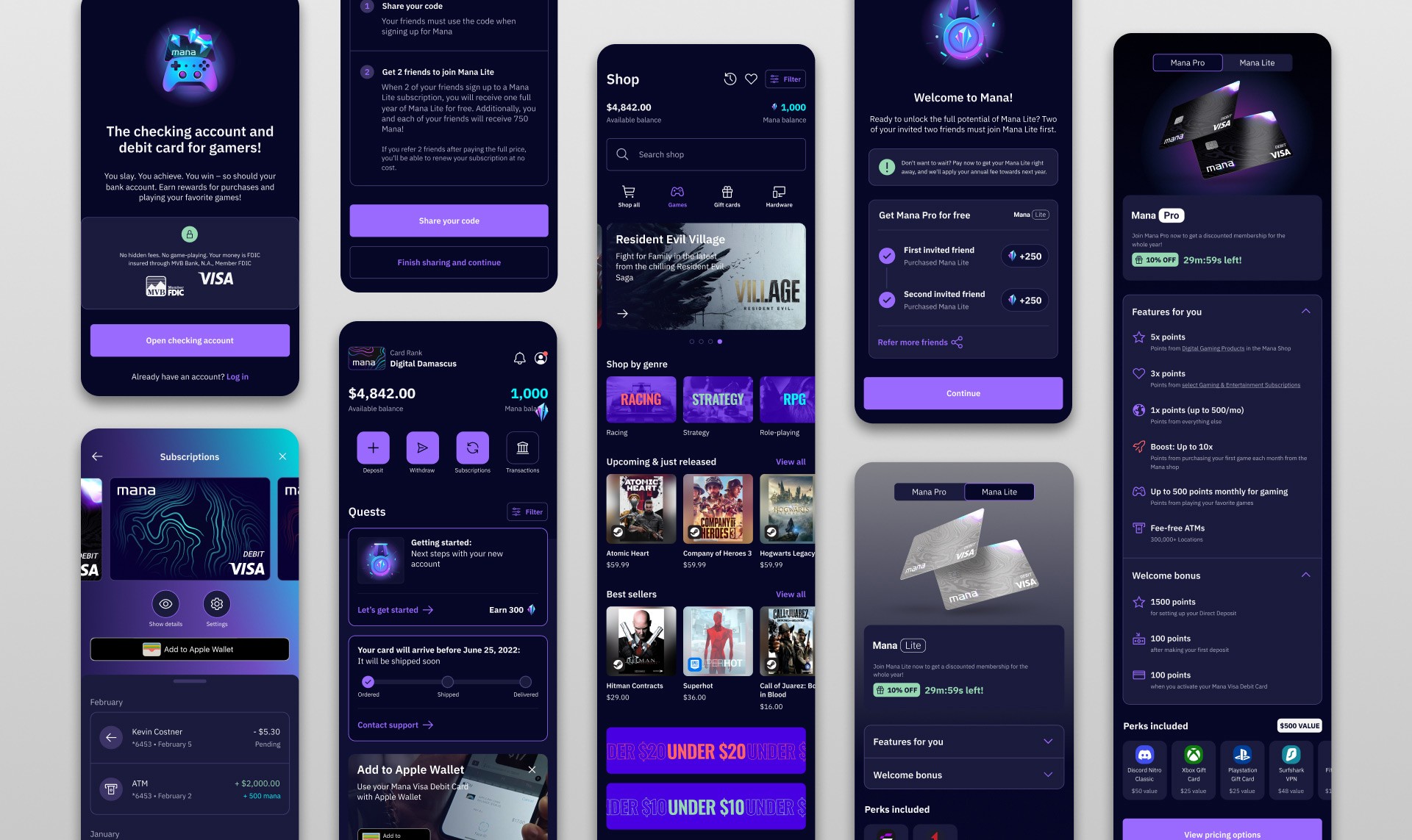 Mana is a fintech mobile app built for gamers, combining banking with a rewards-driven debit card and gamified features. Users earn points from daily spending, unlock exclusive gaming perks, and track finances in a sleek, gaming-inspired UI. I was hired as Lead UX/UI Designer to shape the full user experience and visual identity, including card management, rewards, quests, and perks. I worked with product and development teams to design a mobile-first app that feels like a game but functions as a solid banking tool. From the ground up, I created user flows, screen designs, and interactive prototypes in Figma, collaborating with a junior UX/UI designer I onboarded. We ran 1-on-1 user testing with clickable Figma prototypes—first with gamers from Discord opening their first checking accounts, then with active users post-launch—to polish the experience. The app had to be intuitive for young gamers despite complex banking tasks. I simplified spending tracking and rewards management while crafting a visual style that fit the gaming aesthetic. Early on, I set up a design system in Figma to keep the look consistent as we iterated based on user feedback and dev needs.